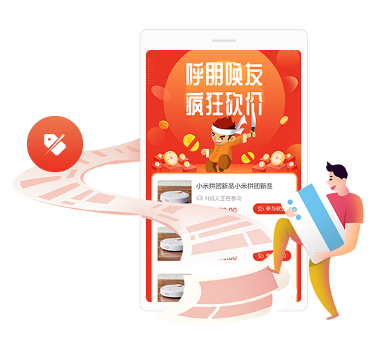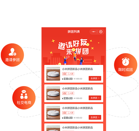 多人拼团,社交获客基于微信社交开展拼团,依靠朋友圈的飞速传播,提升品牌影响力,促进消费者分享带来商品销量,商城订单成倍提升,增加收益。